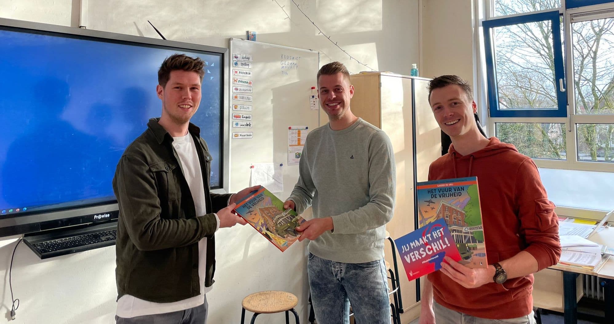 Overhandiging van de stripboeken door Max (links) aan docenten Daniël (midden) en Jasper (rechts)van de St. Jozef Basisschool in Wageningen.