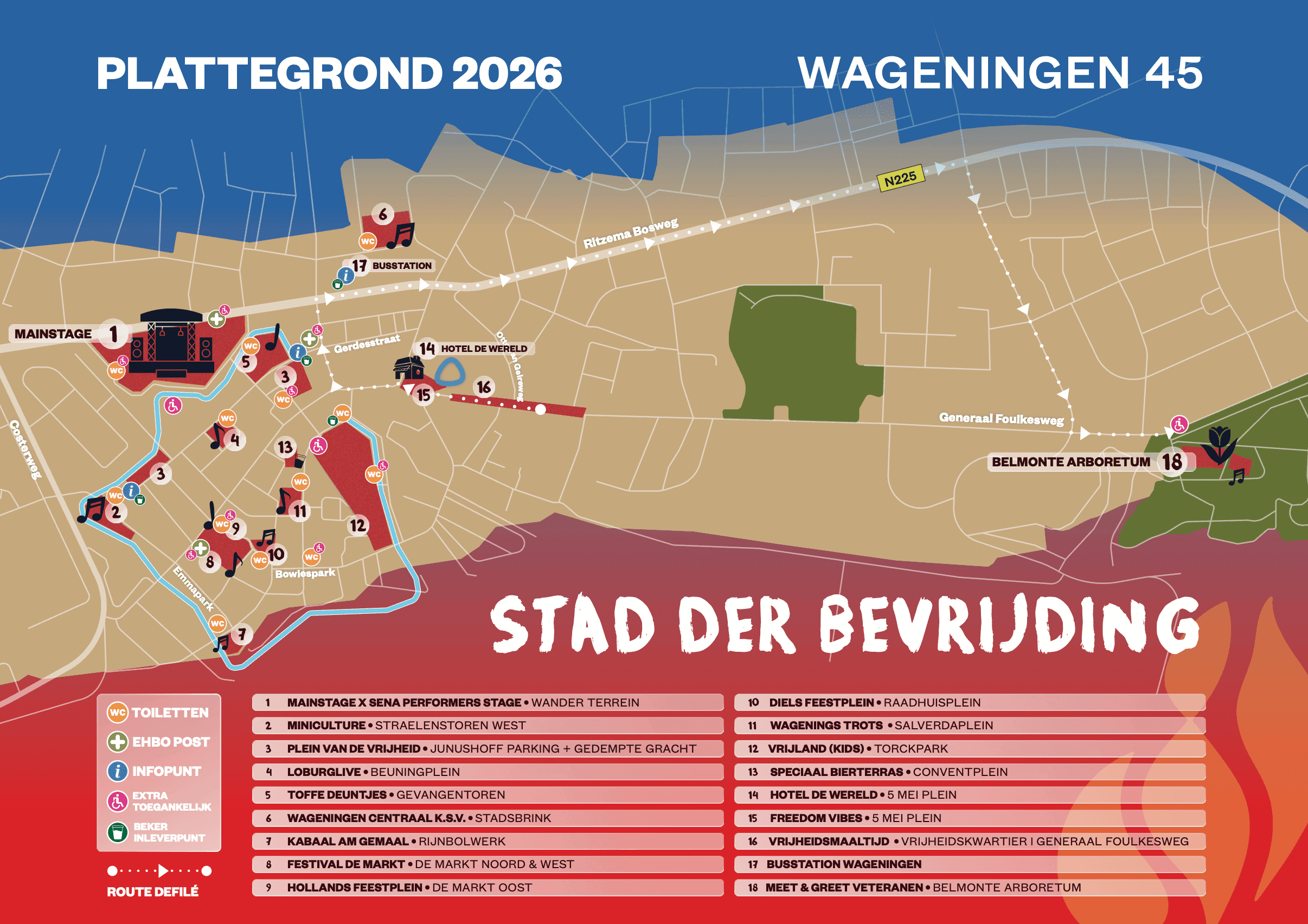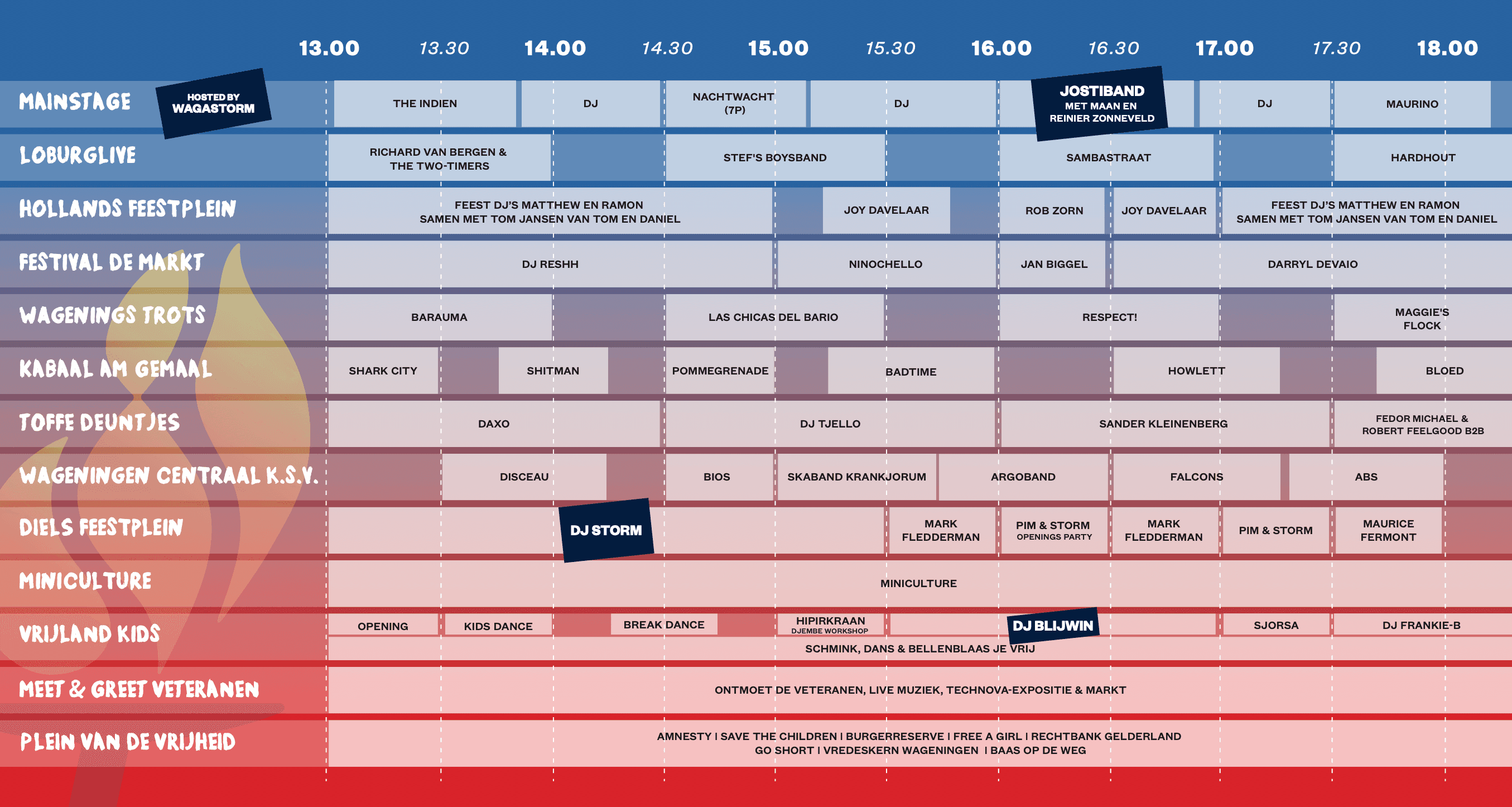 Op het blokkenschema vind je alle optredens tijdens het Bevrijdingsfestival, verspreid over 15 podia door heel Wageningen!